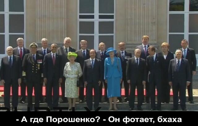 Качество картинки с ТВ было так себе + телек у меня на кухни старый. Словом про построение. Строились долго. Постоянно кто-то куда-то отходил. Шоколад стоял один и улыбался. Отдалённо от всех. По центру как-то сразу Меркельс Оланд сколотили двойничёк. наш появился в кадре пойзже. Занял своё место в первом ряду. И как-то сразу к нему приклеился сосед, с кем они и продолжали всё построение что-то перетирать. Хз кто это -так и не понял, и диктор тоже не распознал. Обама прошёл миом Петра и вроде как даже похлопал его, но не остановился и вклинился в компашку к Меркель. Вообще вёла себя обезьяна, как своячок, мол вам тут всё в новинку, а я уже ни одно такое мероприятие посетил. Пытался выглядеть душой компании. Наигранно всё так явно. К В.В. нашему не подходил. За Путиным с собеседником долго никто во второй ряд не вставал. Рядом с Путином ближе к центру стояла дама в голубом и шляпе :) Хз кто это? Я думал, кроме меркель там тёток больше нет. Английская королева? С Путиным не общалась Редактировалось 06 июн 2014 15:44