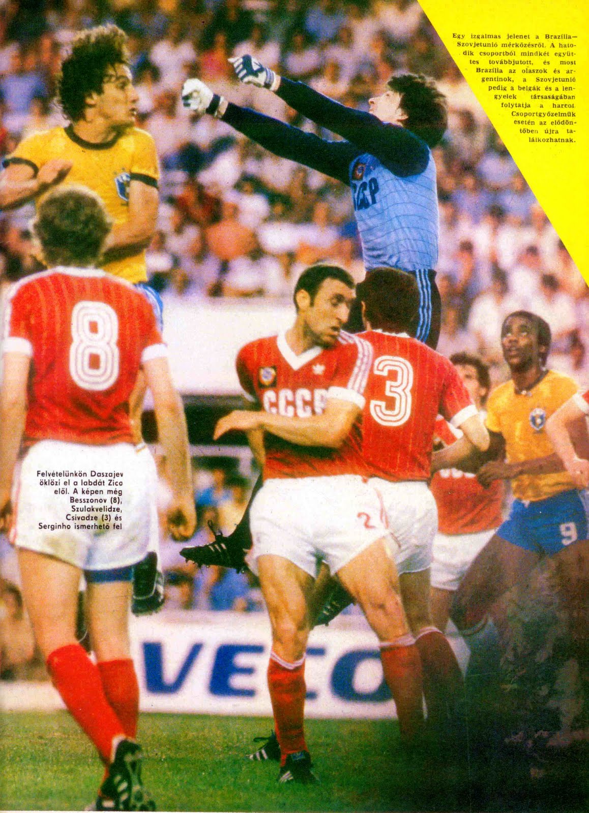 Hacerce un lio (испанская поговорка) - "Запутаться в трёх соснах". "Из Барселоны в Севилью мы добирались через Мадрид весь день. В самолете, следующем рейсом Мадрид - Севилья, встретили знаменитого Эйсебио. Он тренирует юношей в "Бенфике", а на чемпионат мира прибыл как комментатор одной из лиссабонских газет. На матч в Севилью летел, чтобы "сопоставить два направления в футболе - европейское и южноамериканское и извлечь пользу для своей практической работы". Эйсебио высоко отозвался о мастерстве Яшина, Шестернева, Воронина, с которыми вместе участвовал в чемпионате мира 1966 года в Англии, о новом поколении советских футболистов, но предпочтение все же отдал бразильцам. Круифф, которого я встретил в барселонском пресс-центре, без тени сомнения заявил: "Советская сборная сильна, но выиграют бразильцы" (В. Асаулов, "Футбол-хоккей" №25, 1982). "Столица Андалузии встретила советскую сборную 40-градусной жарой. Днем перед игрой на центральной площади Севильи ртутный столбик термометра показывал плюс 43 градуса. Даже нам, сидящим в ложе прессы, из-за страшной духоты казалось, что мы находимся в парной. А каково было нашим футболистам? Ведь им противостояла одна из сильнейших команд мира, к тому же часто выступающая у себя дома в таких же погодных условиях... Перед первым матчем чемпионата у наших тренеров было немало проблем с определением стартового состава. В тренировочных встречах получили травмы центральные защитники Чивадзе и Хидиятуллин. Выбыл из состава Буряк. Только-только вошел в строй Бессонов, который не выступал за сборную почти полгода (не считая недавнего товарищеского матча в Швеции). В общем, читатели поймут, что нашим тренерам пришлось накануне ответственнейших игр создавать не только новую среднюю линию, но и формировать пару центральных защитников. В матче со сборной Бразилии наш капитан Чивадзе вышел на поле, но играть он в полную силу, естественно, не смог. Последствия травмы явно не давали ему возможность подключаться в атаки" (В. Понедельник, "Советский спорт" от 16 июня). С учётом замен, в советской сборной были представлены 5 клубов ("Динамо" К - 5, "Динамо" Тб - 4, "Спартак" - 2, "Торпедо" - 1, СКА Р-Д - 1), в бразильской - 7 ("Сан-Паулу" - 3, "Фламенго" - 3, "Атлетико Минейру" - 2, "Коринтианс" - 1, "Гремиу" - 1, "Атлетико" М - 1, "Рома" - 1). Также с учётом замен, в советской сборной было 9 игроков двадцати пяти или младше лет, в бразильской - 3. "Мы пришли на стадион "Санчес Писхуан" часа за два до начала. Бразильская торсида (болельщики), разодетая в желто-зеленые футболки и шапочки, с желто-зелеными флагами, вооружившись трубами, трещотками, барабанами, под зажигательную "самбу", которую исполняли два оркестра, лавиной двинула на стадион. Из 70000 болельщиков, заполнивших трибуны, каждый седьмой был бразильцем. Да, торсида находилась, как говорится, в своей тарелке (Асаулов). "Начало матча советская сборная провела уверенно. Никакой суетливости, полный контроль над мячом в середине поля, резкие проходы Шенгелия и Блохина по флангам с последующими острыми передачами вдоль ворот, обстрел их с дальних и средних дистанций. Своевременно подключались в атаки полузащитники и особенно левый защитник Демьяненко, действовавший временами как заправский крайний форвард. Трибуны то и дело встречали действия советских игроков аплодисментами. Не оставались в долгу и наши именитые соп