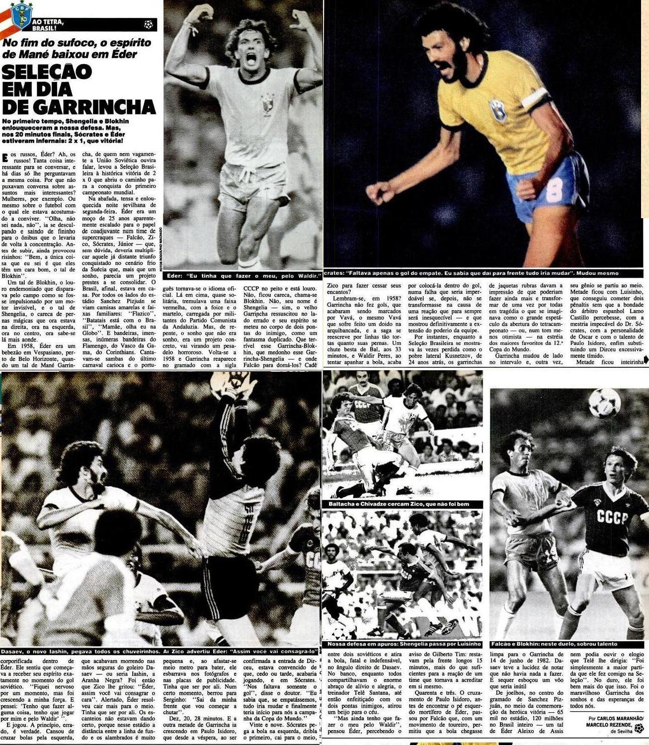 Hacerce un lio (испанская поговорка) - "Запутаться в трёх соснах". "Из Барселоны в Севилью мы добирались через Мадрид весь день. В самолете, следующем рейсом Мадрид - Севилья, встретили знаменитого Эйсебио. Он тренирует юношей в "Бенфике", а на чемпионат мира прибыл как комментатор одной из лиссабонских газет. На матч в Севилью летел, чтобы "сопоставить два направления в футболе - европейское и южноамериканское и извлечь пользу для своей практической работы". Эйсебио высоко отозвался о мастерстве Яшина, Шестернева, Воронина, с которыми вместе участвовал в чемпионате мира 1966 года в Англии, о новом поколении советских футболистов, но предпочтение все же отдал бразильцам. Круифф, которого я встретил в барселонском пресс-центре, без тени сомнения заявил: "Советская сборная сильна, но выиграют бразильцы" (В. Асаулов, "Футбол-хоккей" №25, 1982). "Столица Андалузии встретила советскую сборную 40-градусной жарой. Днем перед игрой на центральной площади Севильи ртутный столбик термометра показывал плюс 43 градуса. Даже нам, сидящим в ложе прессы, из-за страшной духоты казалось, что мы находимся в парной. А каково было нашим футболистам? Ведь им противостояла одна из сильнейших команд мира, к тому же часто выступающая у себя дома в таких же погодных условиях... Перед первым матчем чемпионата у наших тренеров было немало проблем с определением стартового состава. В тренировочных встречах получили травмы центральные защитники Чивадзе и Хидиятуллин. Выбыл из состава Буряк. Только-только вошел в строй Бессонов, который не выступал за сборную почти полгода (не считая недавнего товарищеского матча в Швеции). В общем, читатели поймут, что нашим тренерам пришлось накануне ответственнейших игр создавать не только новую среднюю линию, но и формировать пару центральных защитников. В матче со сборной Бразилии наш капитан Чивадзе вышел на поле, но играть он в полную силу, естественно, не смог. Последствия травмы явно не давали ему возможность подключаться в атаки" (В. Понедельник, "Советский спорт" от 16 июня). С учётом замен, в советской сборной были представлены 5 клубов ("Динамо" К - 5, "Динамо" Тб - 4, "Спартак" - 2, "Торпедо" - 1, СКА Р-Д - 1), в бразильской - 7 ("Сан-Паулу" - 3, "Фламенго" - 3, "Атлетико Минейру" - 2, "Коринтианс" - 1, "Гремиу" - 1, "Атлетико" М - 1, "Рома" - 1). Также с учётом замен, в советской сборной было 9 игроков двадцати пяти или младше лет, в бразильской - 3. "Мы пришли на стадион "Санчес Писхуан" часа за два до начала. Бразильская торсида (болельщики), разодетая в желто-зеленые футболки и шапочки, с желто-зелеными флагами, вооружившись трубами, трещотками, барабанами, под зажигательную "самбу", которую исполняли два оркестра, лавиной двинула на стадион. Из 70000 болельщиков, заполнивших трибуны, каждый седьмой был бразильцем. Да, торсида находилась, как говорится, в своей тарелке (Асаулов). "Начало матча советская сборная провела уверенно. Никакой суетливости, полный контроль над мячом в середине поля, резкие проходы Шенгелия и Блохина по флангам с последующими острыми передачами вдоль ворот, обстрел их с дальних и средних дистанций. Своевременно подключались в атаки полузащитники и особенно левый защитник Демьяненко, действовавший временами как заправский крайний форвард. Трибуны то и дело встречали действия советских игроков аплодисментами. Не оставались в долгу и наши именитые соп