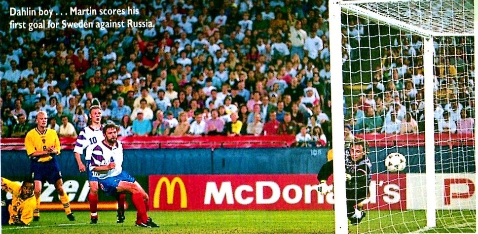 В другом матче в группе B Камерун и Швеция сыграли вничью - 2:2. ...Соотношение "свои" / легионеры, с учётом замен: Россия: 4 / 9 ("Спартак" - 4; на сей раз - по двое из "Расинга" и "Эспаньола"и добавляем "Кан" Мостового); Швеция: 4 / 9 (зарубежные клубы: "Боруссия" М - 2, "Бенфика", "Галатасарай", "Лилль", "Наполи", "Парма", "ПСВ", "Фейеноорд"). "Уже на 2-й минуте матча произошло событие, на которое никто поначалу особого внимания не обратил, но затем оно приобрело для нашей команды характер драмы. А случилось то, что в совершенно безобидной ситуации Горлукович без всякой на то необходимости остановил мяч руками и тут же за это был отмечен желтой карточкой" (О. Кучеренко, "Футбол" №27, 1994). ...О голах в первом тайме: "После передачи с левого фланга в штрафную шведов Юнг заплел ноги Бородюку, тот упал, и французский арбитр Кинью указал на 11-метровую отметку. Пенальти четко реализовал Саленко. ... "Кеннет Андерссон слева сделал мягкую передачу по воздуху в нашу штрафную, Далин в прыжке нанес удар головой, Горлукович предварительно пытался помешать ему это сделать, нарушив правила, что и зафиксировал французский арбитр. Пенальти точно реализовал Брулин" (Кучеренко). "[на 49-й минуте] Горлукович грубо атаковал Далина, за что получил вторую желтую карточку в матче, на глазах превратившуюся в красную. Сборная России осталась вдесятером" (Кучеренко). ...О голах во втором тайме: "Терн слева делает передачу по воздуху в нашу штрафную, а Далин в падении в прыжке головой вколачивает мяч в сетку ворот. Галямин просто не успевает ему помешать. Шведы выходят вперед - 2:1. ... "Шведы провели просто-таки показательную контратаку. Нильссон сделал передачу направо Кеннету Андерссону, а тот, заметив мчащегося на всех парах в штрафную Далина, мягко послал мяч по воздуху через голову Галямина. Шведский "курьерский поезд" прибыл в заданную точку точно по расписанию и в прыжке опять же головой забил красивейший гол - 3:1" (Кучеренко). "А теперь я ознакомлю вас с мнением американской газеты "USA Today" об игре Россия - Швеция. Точнее, приведу оценки и краткие характеристики игры футболистов, данные ею. Итак, Харин - 6 (неправильно выбрал позицию при первом голе Далина), Кузнецов - 6,5 (как правило, начинал атаки команды, но не всегда был последователен), Горлукович - 5,5 (подвел команду тем, что получил красную карточку на 49-й минуте: ранее нередко подключался к атакам), Никифоров - 7 (проявил себя, как созидатель, нередко включался в атаку из глубины), Онопко - 6 (с мячом работал тяжеловато, но неплохо пасовал), Хлестов - 6,5 (весьма быстр, старателен), Попов - 4,5 (плохо включался в атаку, заменен на 40-й минуте). Мостовой - 6 (был опасен только в первом тайме), Бородюк - 5 (излишне спокоен, необходимо было больше активности), Радченко - 6 (сильный, упустил несколько возможностей), Саленко - 7 (имел ряд шансов добиться успеха, был неплох в первом тайме), Галямин - 5,5 (был заметен, но не более того), Карпин - 6 (не успокаивался даже тогда, когда игра была уже сделана). Как вы понимаете, это чисто субъективные оценки (кстати, по десятибалльной системе), с которыми можно соглашаться или поспорить. Так, например, кажется, что оценка Саленко явно завышена. Есть и другие замечания, но суть не в этом, а просто в знакомстве с еще одним мнением. К слову, оценки шведским игрокам выставлены следующие: Равелли - 7, Нильссон - 7,5, П. Андерссон - 7,5, Бьорклунд - 7,5, Юнг - 7,5, Швар