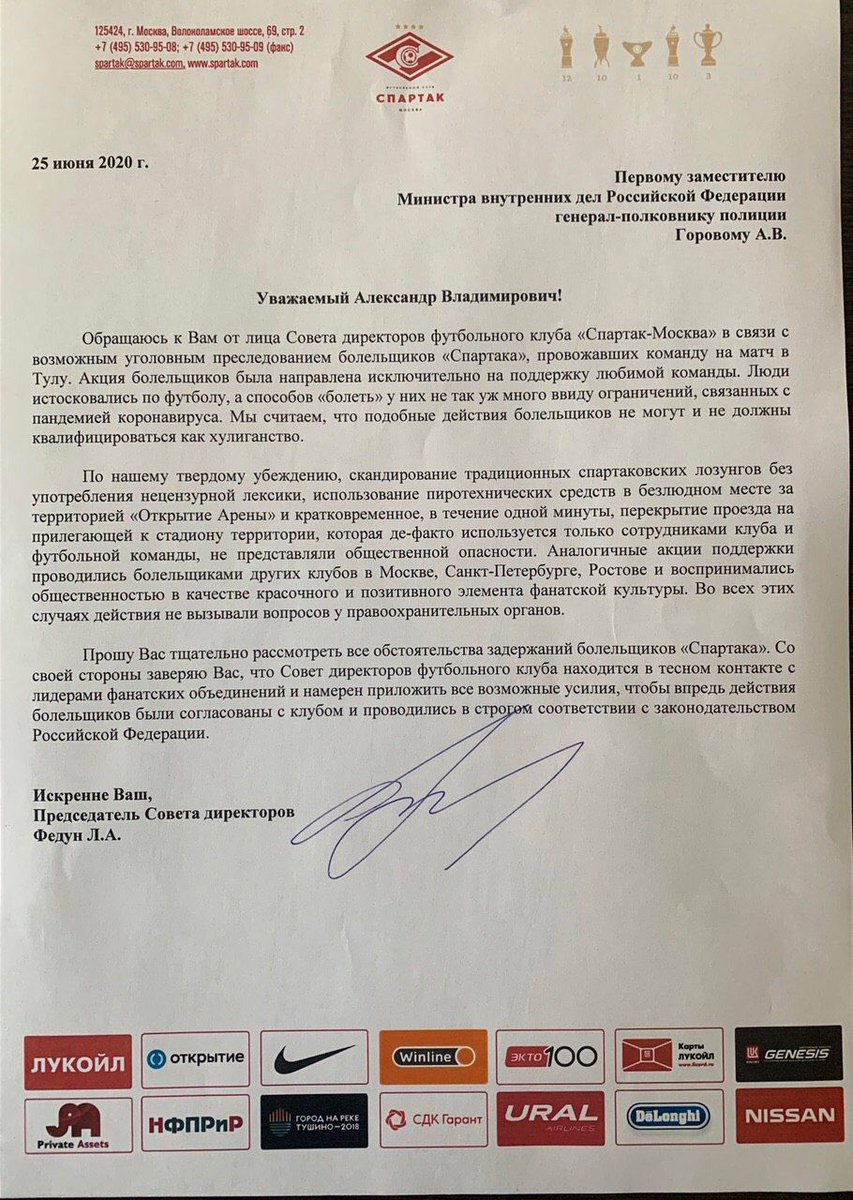 1. Фанатов вяжут за проводы и заводят дело по хулиганке (с обысками) вместо административки (это максимум) по наводке СБ Лукойла. 2. Так как дело изначально с хреновой судебной перспективой (развалится в суде) все это сделано с целью попиарить Барина, который аки Атец родной встанет горой за болельщиков. 3. Лисин отказался участвовать в этой комбинации "мастера разводок". Его увольняют (доработает, но отодвинут). Но комбинация уже запущена... 4. Федун и новые медийщики сегодня проявляются: ... З.Ы. Нафига в письмо вставлять всех спонсоров? :) Ну, не знаю...